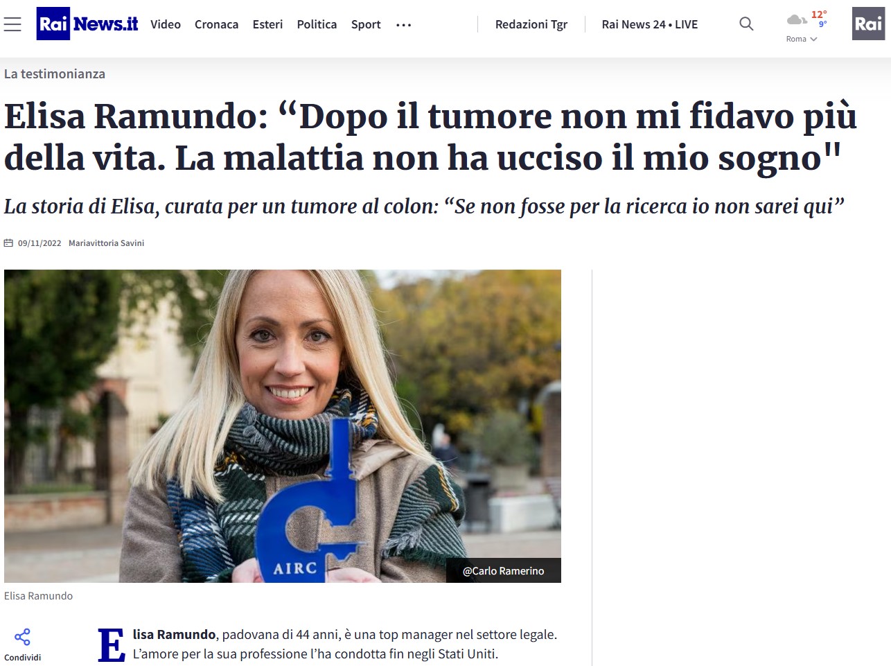 Dal 2021, Elisa Ramundo è anche testimonial AIRC per sostenere la ricerca sul cancro (sotto, il video, girato con AIRC, racconta la sua storia di paziente oncologica). Sa bene come ci si sente spaesati, incompresi e poco ascoltati, quando davanti alla malattia oncologica si hanno tante domande e, a volte, poche risposte utili ed esaurienti.