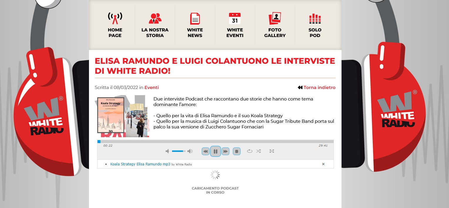 Elisa Ramundo intervistata da Giulia Gianassi per i microfoni di White Radio parla della sua storia e di Koala Strategy, il libro e il portale online. Tema dominante e forza propulsiva del racconto di Elisa è l’amore: per la vita, la famiglia, gli amici. Senza questo amore, spiega Elisa, affrontare tutto sarebbe stato più difficile. Ed è proprio questo amore che Elisa usa per aiutare chi si trova oggi ad affrontare una diagnosi di cancro.