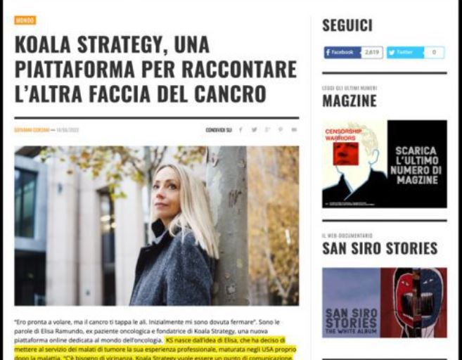 Koala Strategy nasce dall’idea di Elisa che ha deciso di mettere a servizio dei malati di tumore la sua esperienza professionale, maturata negli USA proprio dopo la malattia. “C’è bisogno di vicinanza. Koala Strategy vuole essere un punto di comunicazione perché manca una vera e propria rete per chi si ammala di cancro”, spiega Elisa